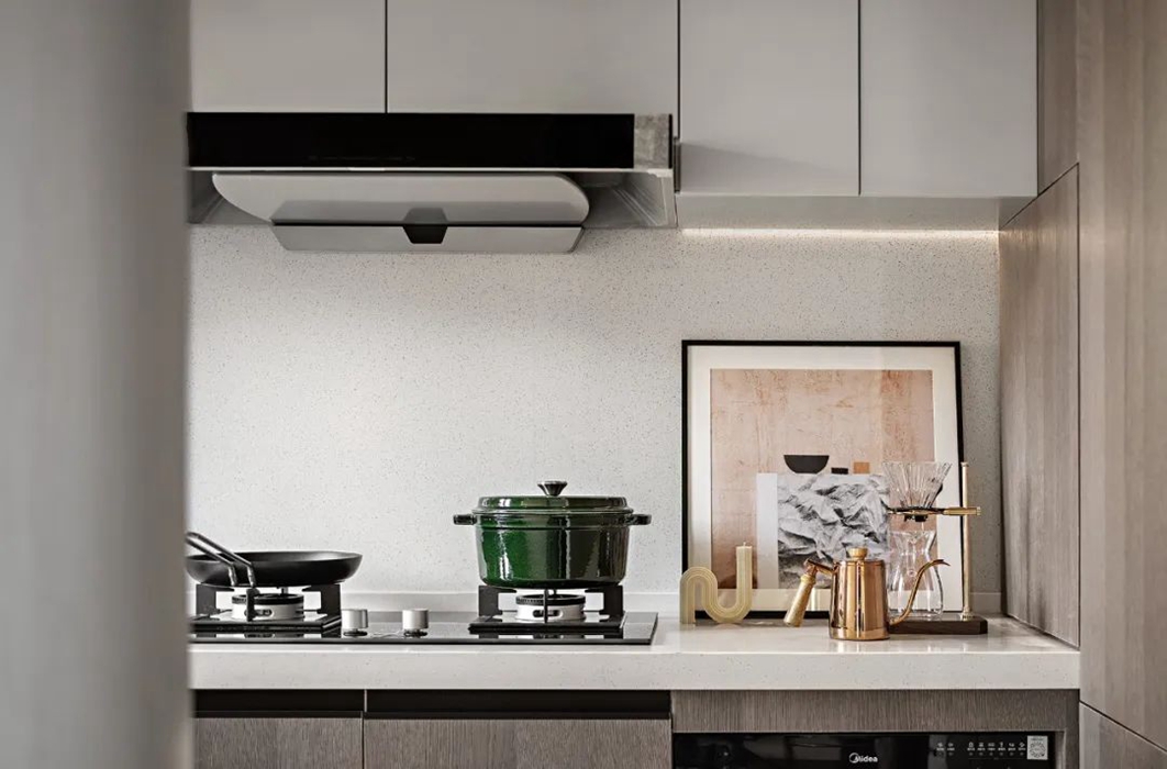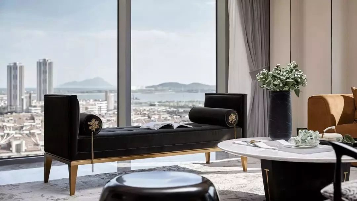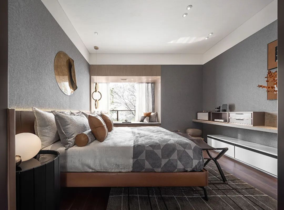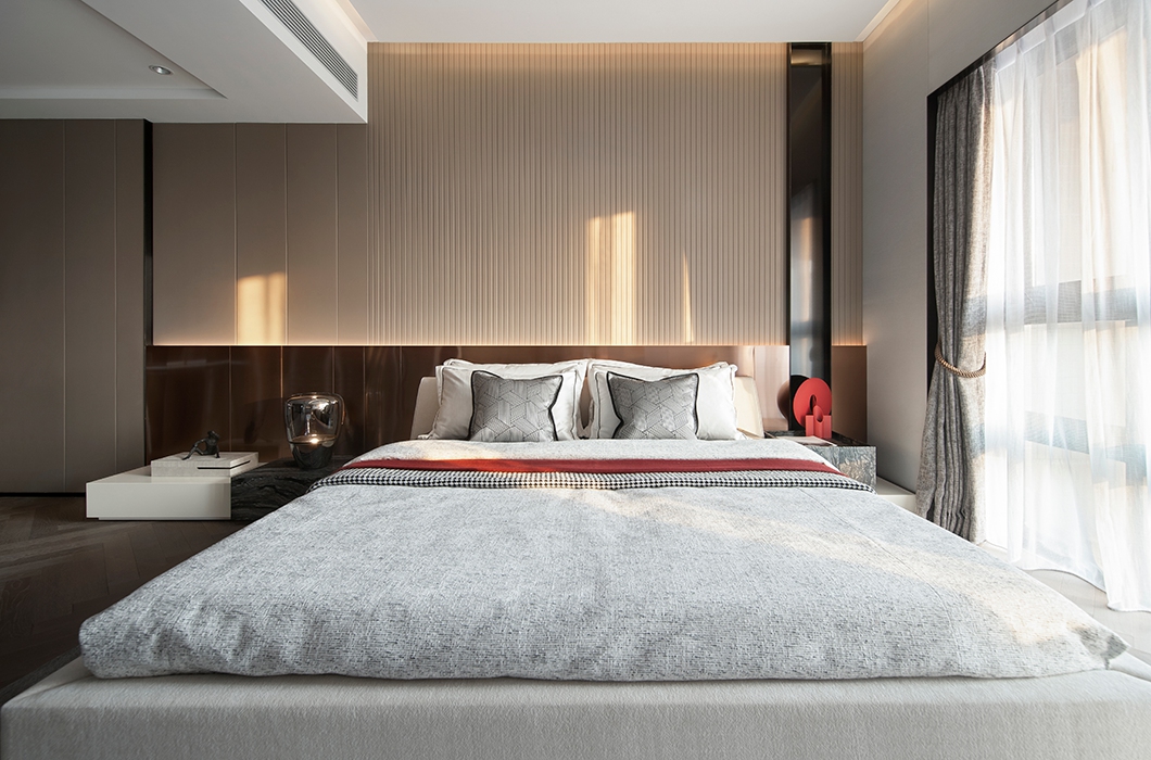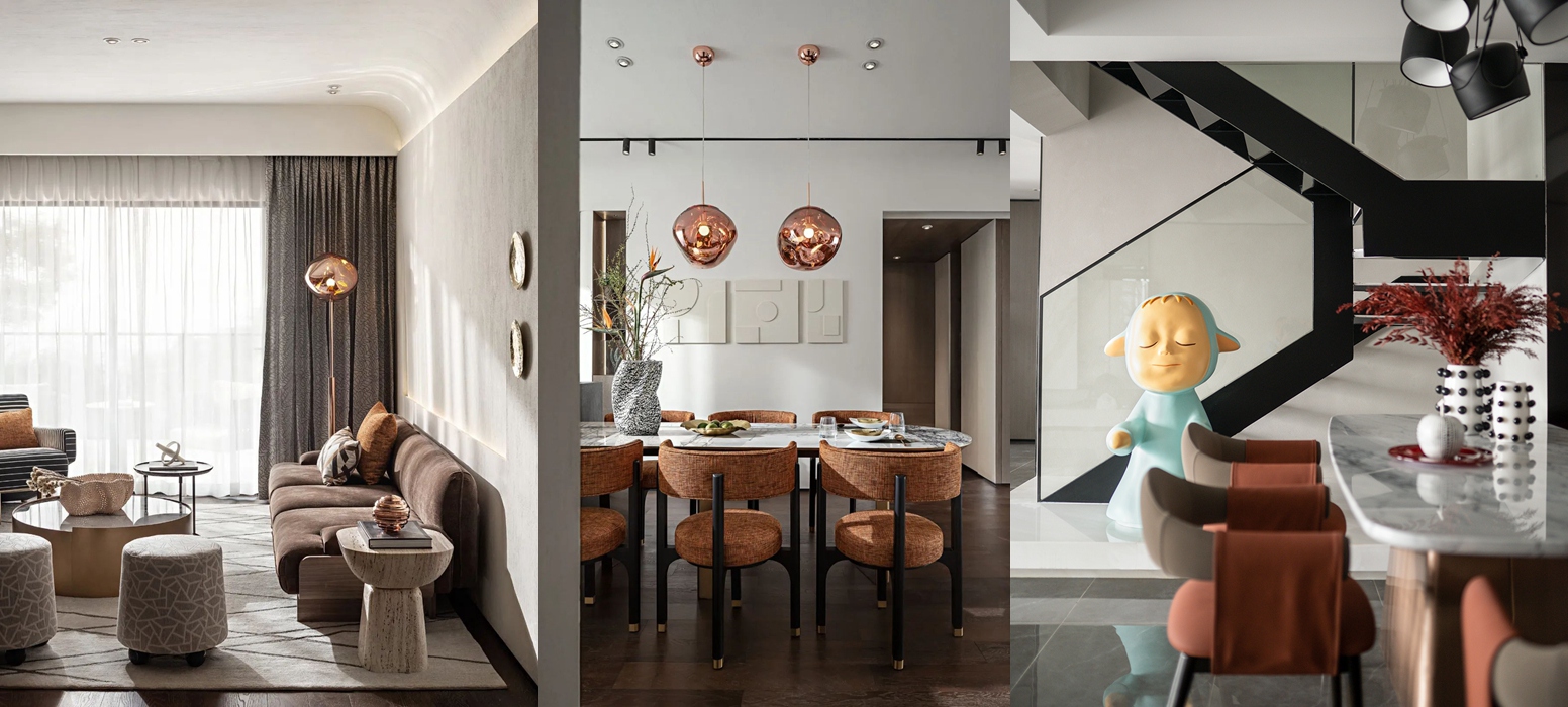 设计师通过丰富的设计经验,将材质的不同质感进行布局与搭配,使线条、色彩、体块等方面完美融入到这个空间中,在呈现空间艺术的同时也兼顾到了功能性。 家的本质是内心的归属。在都市繁华中独善其身,寻得一份宁静。城市现代化的高速发展,在喧嚣中拥有一方守静之地,心灵的栖居之所。设计为功能空间注入灵魂,在基于物质实用性的基础上带来审美的变化。似乎已成为每个城市人的期待。 这里承载着家庭欢聚、休闲、社交的功能,宽厅赋予客厅可居、可学、可玩的多种属性。模糊了常规的空间界限,使得整个空间饱满流畅。凝练又有艺术感染力的空间语言,呈现出雅奢精致的氛围。 空间色以现代风格黑白灰为主基调,同时加入暖棕、金色提亮空间。精致的摆设,艺术品加持,搭配柔软的沙发、温和的灯光,让大尺度的豪华空间也不失家的舒心与温暖。 轻风翻动起窗纱,青苔长在湿赭色的树干上、种满绿植的露台上。呼吸吐纳间,尽是自然的韵律与流动。在阳台坐着,晒太阳,看着,看很长时间,好像在想点什么,好像没想什么。