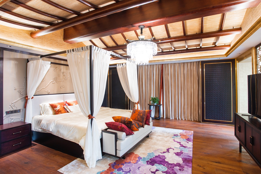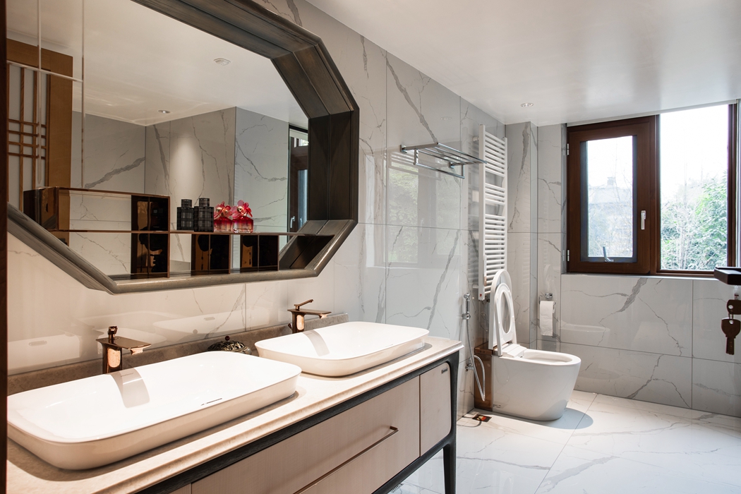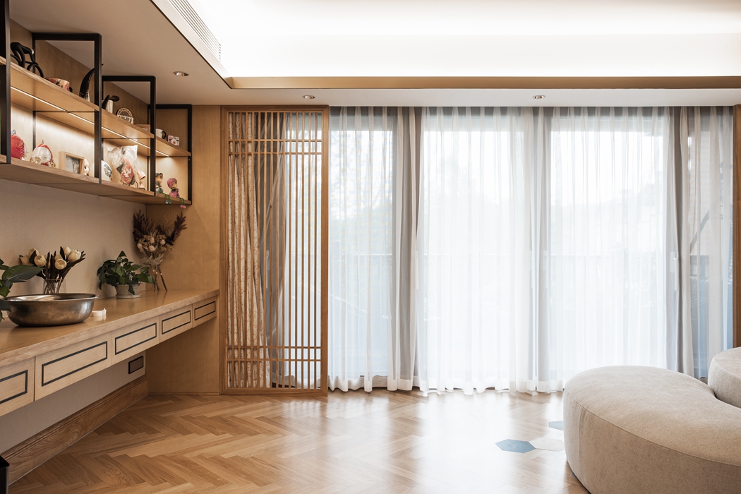 整体设计与布局将中式元素与现代材质巧妙兼柔,打造当代轻奢新中式风格。设计师在空间打造中注入多元化现代材质,搭配巧妙跳色,让新中式焕发出时尚轻奢的都市风采。木饰面收口处也以金属条点缀。硬朗的金属条与温润的木饰面,是动与静、刚与柔的完美演绎。中国古代家具上有各式各样的图纹,饱含着人们对生活的美好憧憬,设计师将这份传统的文化底蕴和风骨委婉的融入到空间中,体现浓厚的中式美学韵味,彰显东方美学态度,表达主人对吉祥、喜庆、幸福的美好憧憬。